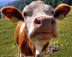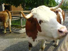 Links sehen Sie zwei unserer Kuh-Models, welche ihr schönes Antlitz dem Zeichner zur Erstellung des Logos zur Verfügung gestellt haben. Mit dem Gesicht zur Kamera steht die immer etwas streitsüchtige Arabella*. Berta* wollte partout nur ihr Hinterteil zur Verfügung stellen. Diesen Wunsch haben wir akzeptiert. |